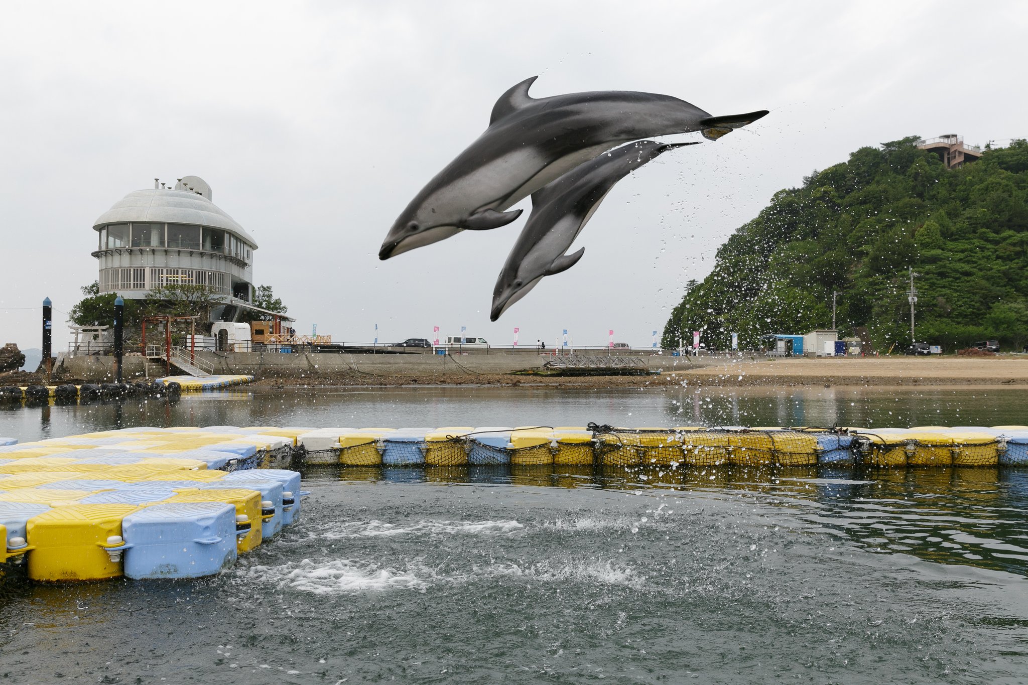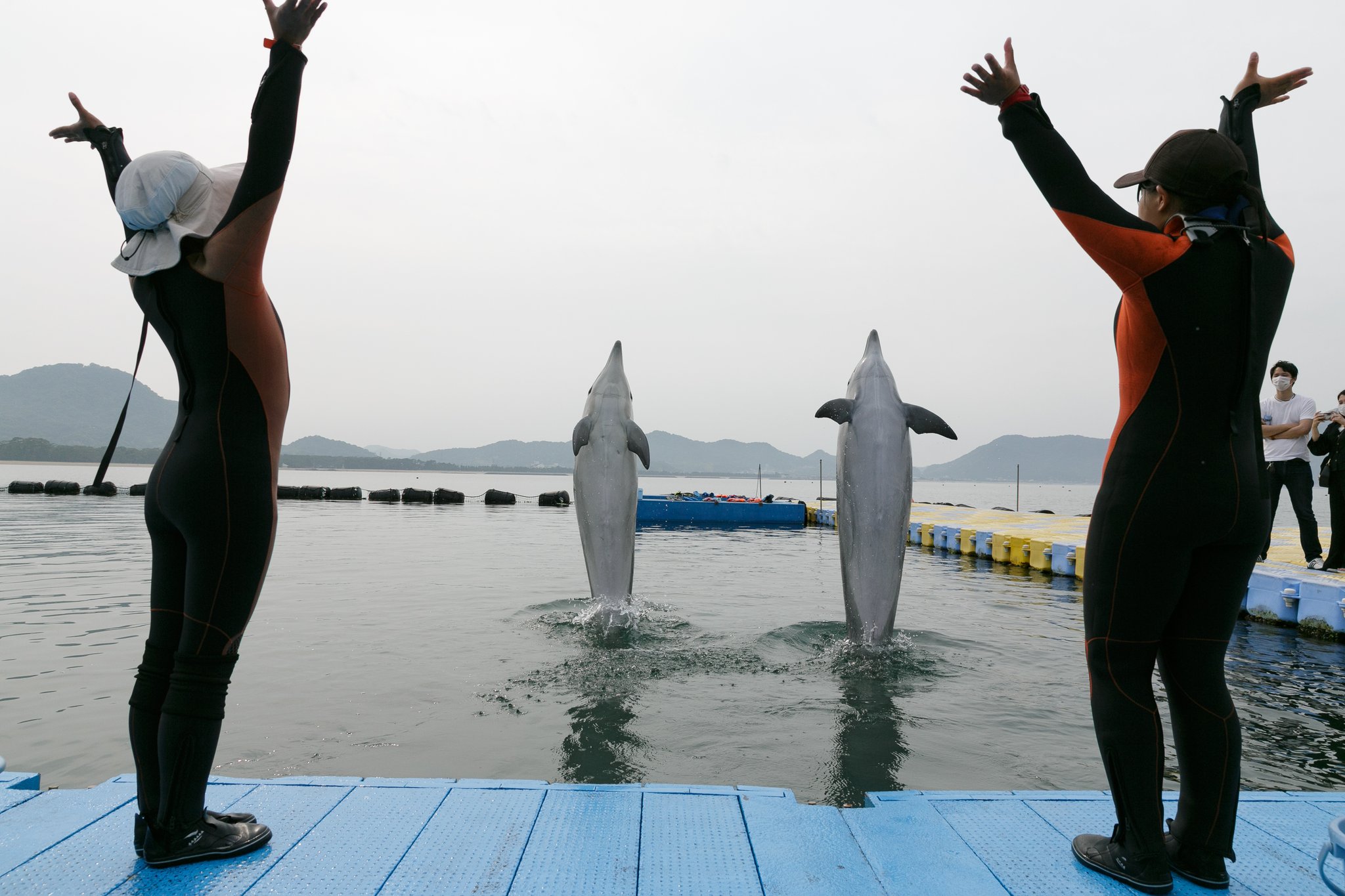 ぜひともイルカの躍動感あふれるトレーニングをご見学ください。悪天候、イルカの状態等により中止する場合がございます。