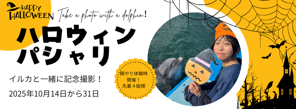 今年も、ハロウィンの季節がやってまいりました。そこで恒例となっております、『ハロウィンパシャリ』を開催いたします。ハロウィンの被り物をして、イルカと一緒に記念撮影ができます。お客様ご自身がコスプレで参加いただいても構いませんよ!