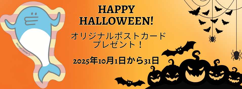 ハロウィンイベント第1弾は、小学生以下のお客様にオリジナルポストカードをプレゼントします。キモかわいいイルカをかたどった、ドルフィンセンターオリジナルポストカードです。