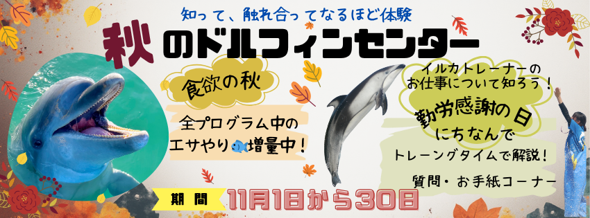 『知って、触れ合ってなるほど体験』と題しまして、期間限定の秋のドルフィンセンターキャンペーンを開催いたします。