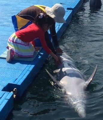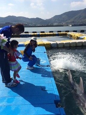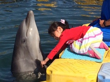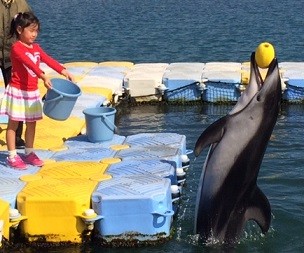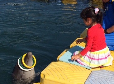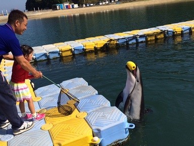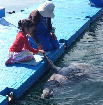 イルカさんとお客様で早く10回足ぶみ(バタ足)出来たほうが勝ち!!