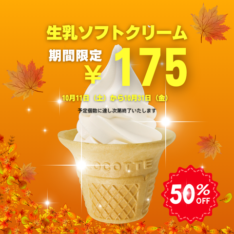 11日 10月 2025 ソフトクリーム半額キャンペーン 特別イベントとして、生乳ソフトクリーム通常¥350(税込)を半額の¥175(税込)でご提供させて頂きます。 期間限定、数量限定企画となっておりますので、この機会に是非ご賞味ください。 (期間)2025年10月11日(土)から10月31日(金) 予定数量がなくなり次第、終了させて頂きます。 tagPlaceholderカテゴリ: イベント
