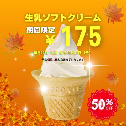 11日 10月 2025 ソフトクリーム半額キャンペーン 予定数量に達したため、キャンペーンは終了しました。 特別イベントとして、生乳ソフトクリーム通常¥350(税込)を半額の¥175(税込)でご提供させて頂きます。 期間限定、数量限定企画となっておりますので、この機会に是非ご賞味ください。 (期間)2025年10月11日(土)から10月31日(金) 予定数量がなくなり次第、終了させて頂きます。 tagPlaceholderカテゴリ: イベント
