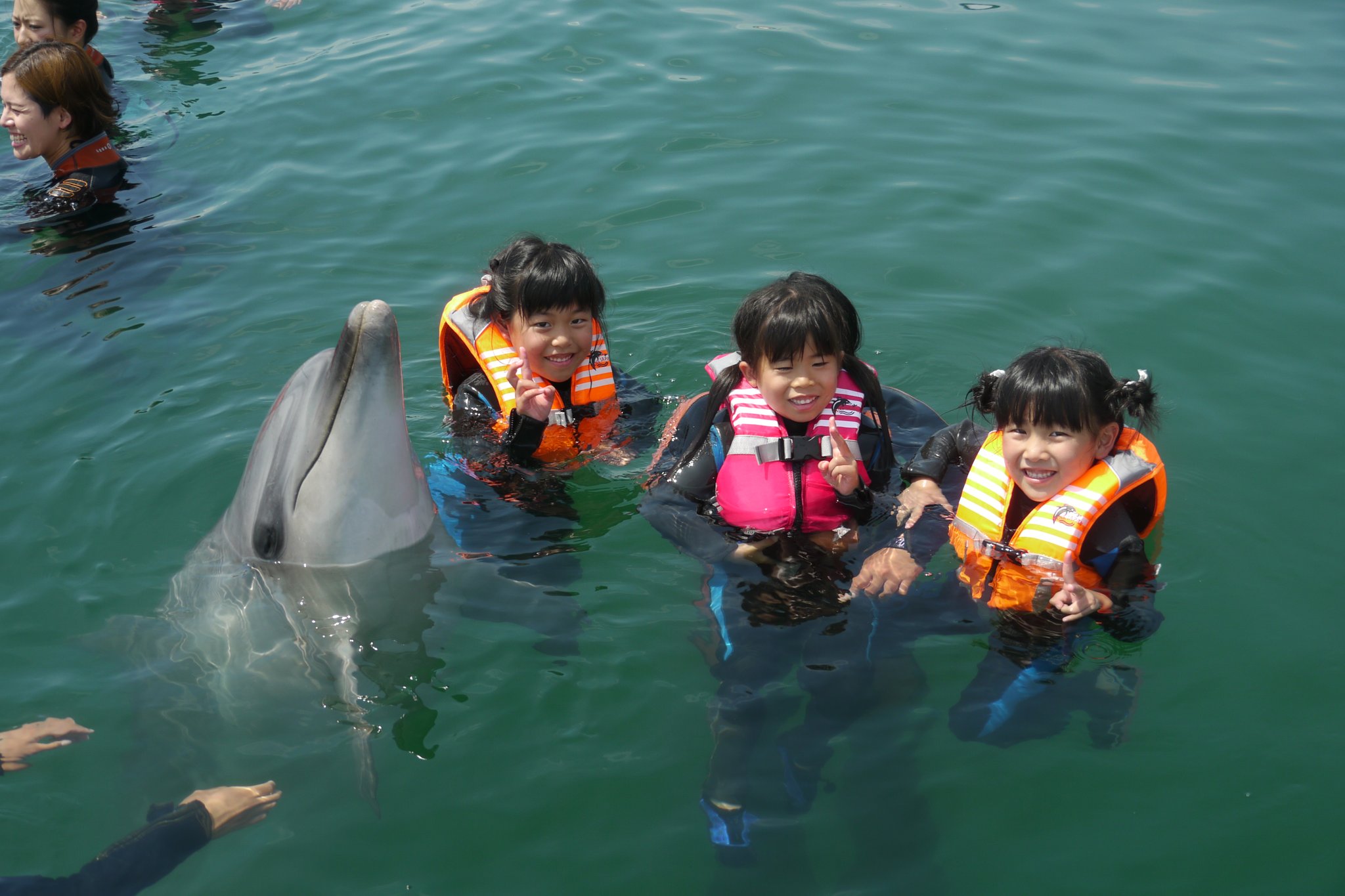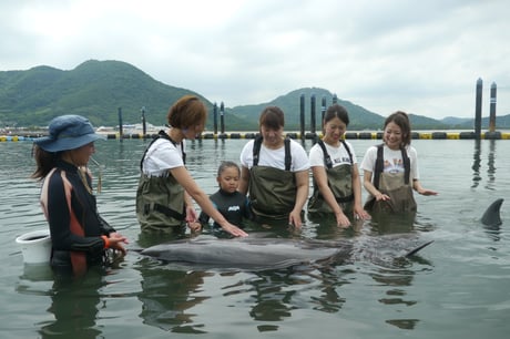 Experiencing touching dolphins by entering the shallows water up to the waist. Recommended for those who are not good at swimming! For adults, you can join it without changing into your swimsuit.